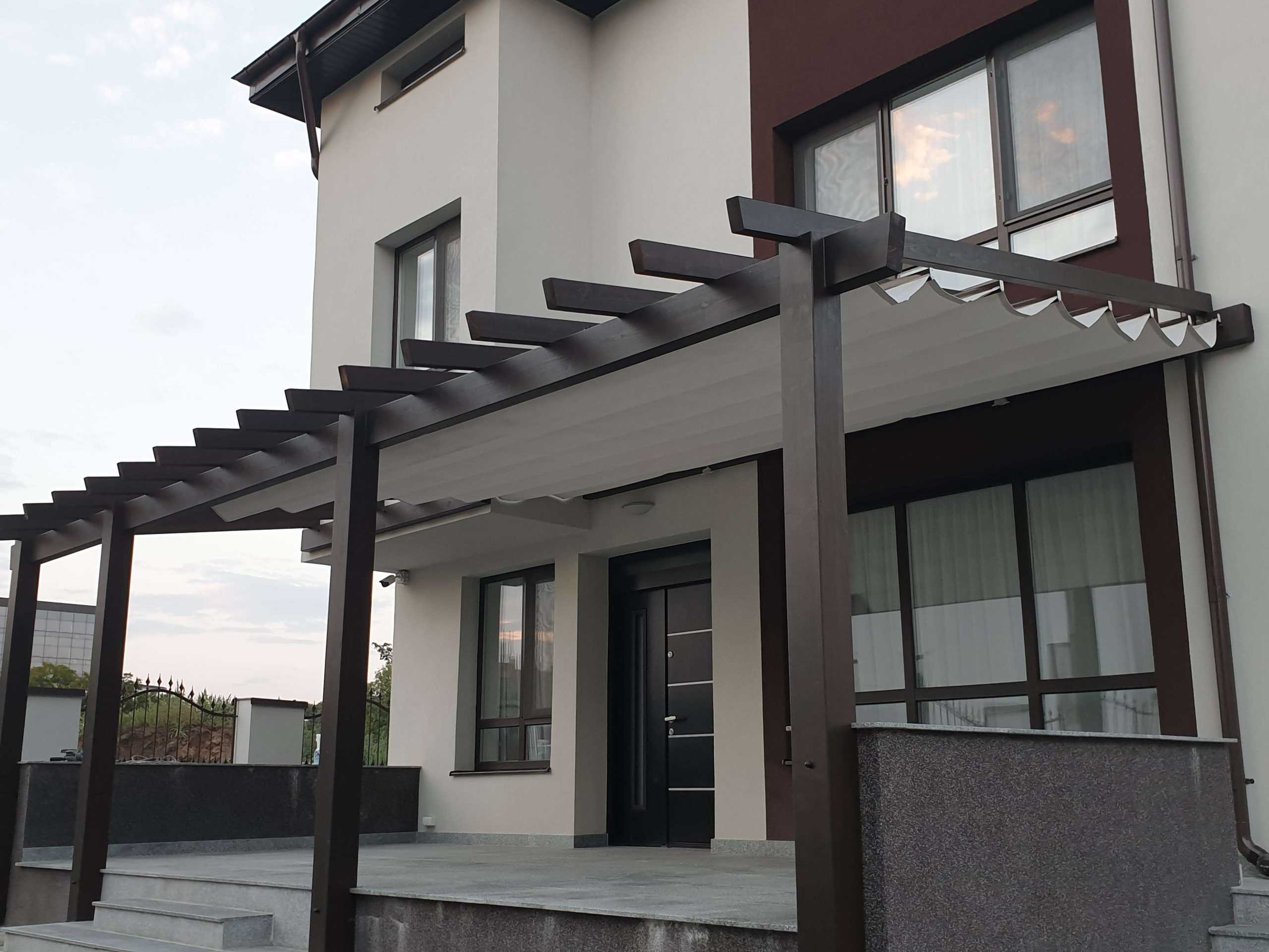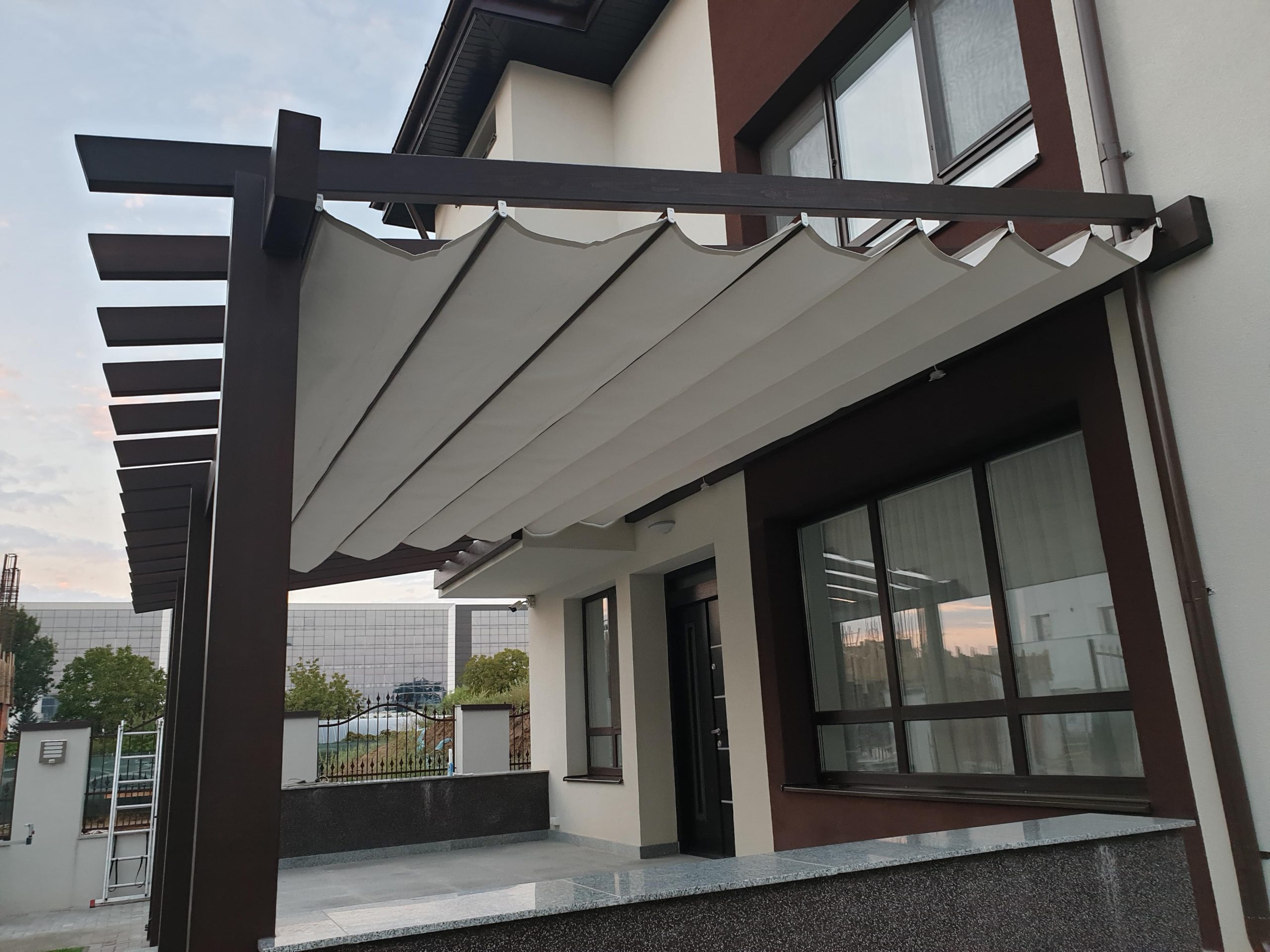 Materialul textil impermeabil (acrilic sau poliester cu strat PU) se monteaza sub structura de grinzi in sistem de falduri — se strange sau se intinde manual sau cu motor. In pozitia deschisa faldurile se aduna la una din extremitati, lasand pergola complet aerisita. In pozitia inchisa materialul acopera complet suprafata si protejeaza de ploaie, soare si grindina usoara.