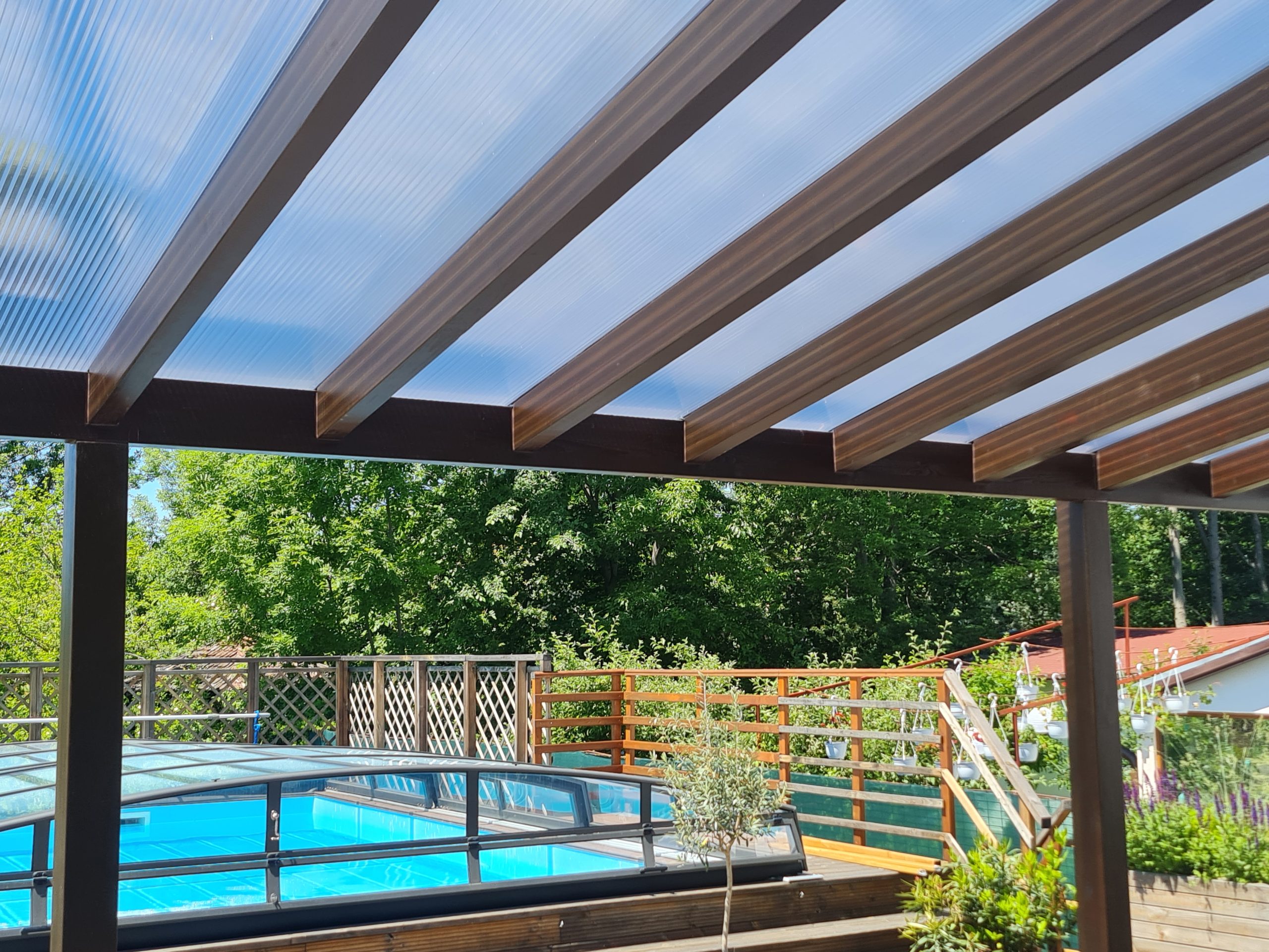 Structura deschisa se poate combina ulterior cu un acoperis retractabil montat intre grinzi — posibilitate de upgrade fara reconstructie.